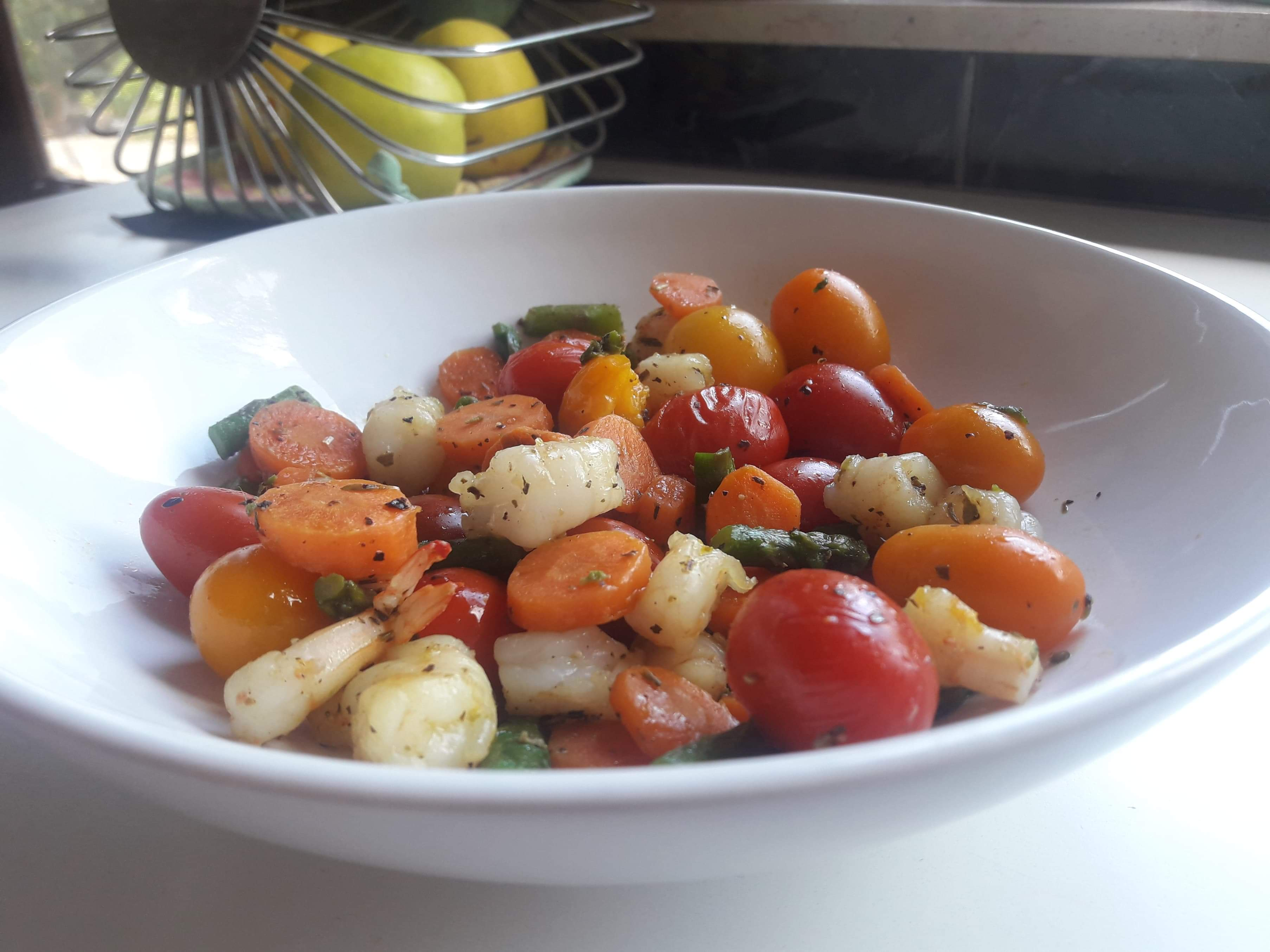 Tip: If you’re short on time, you can also simply sauté the vegetables and shrimp in a pan. Just remember to add the carrots first, then the asparagus, and lastly the cherry tomatoes and the shrimp as they all have different cooking times.